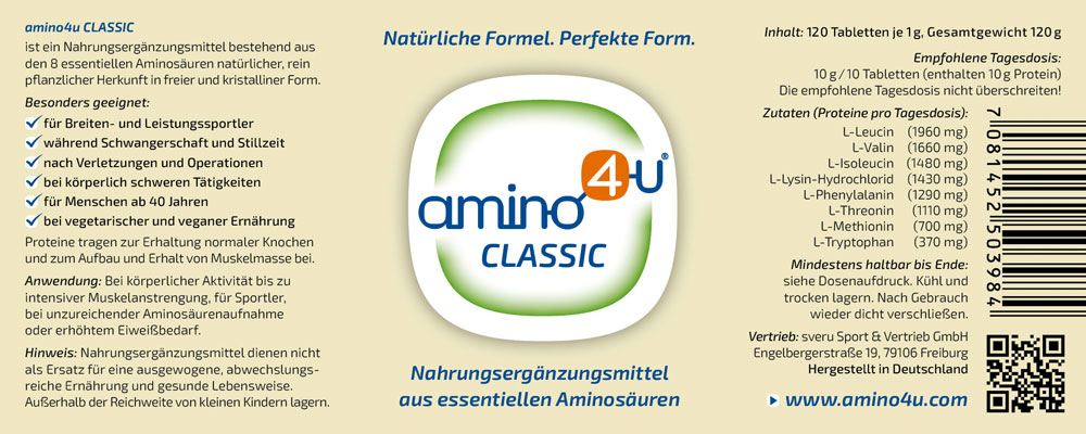 10 Tabletten (= 10 g Pulver) Amino4u enthalten folgende acht essenzielle Aminosäuren: