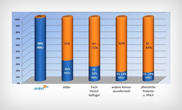 - Amino4u liefert als ideale Zusammensetzung das für den Menschen optimale Aminosäuremuster. Es stellt den höchsten Proteinnährwert überhaupt zur Verfügung und liefert zugleich die geringste Menge an belastendem Stickstoffabfall.