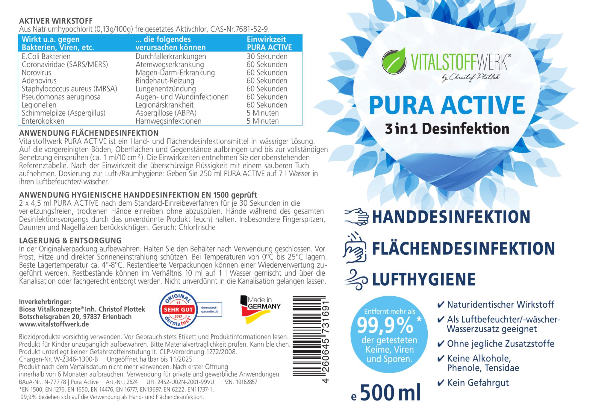 Vitalstoffwerk Pura Active ist ein Hand- und Flächendesinfektionsmittel in wässriger Lösung. Auf die vorgereinigten Böden, Oberflächen und Gegenstände aufbringen und bis zur vollständigen Benetzung einsprühen (ca. 10ml/10 cm²). Die Einwirkzeiten kannst du der Tabelle auf dem Etikett entnehmen. Nach der Einwirkzeit die Überschüssige Flüssigkeit mit einem sauberen Tuch aufnehmen. Dosierung zur Luft-/Raumhygiene: Geben Sie 250 ml Pura Active auf 7 L Wasser in deinen Luftbefeuchter.