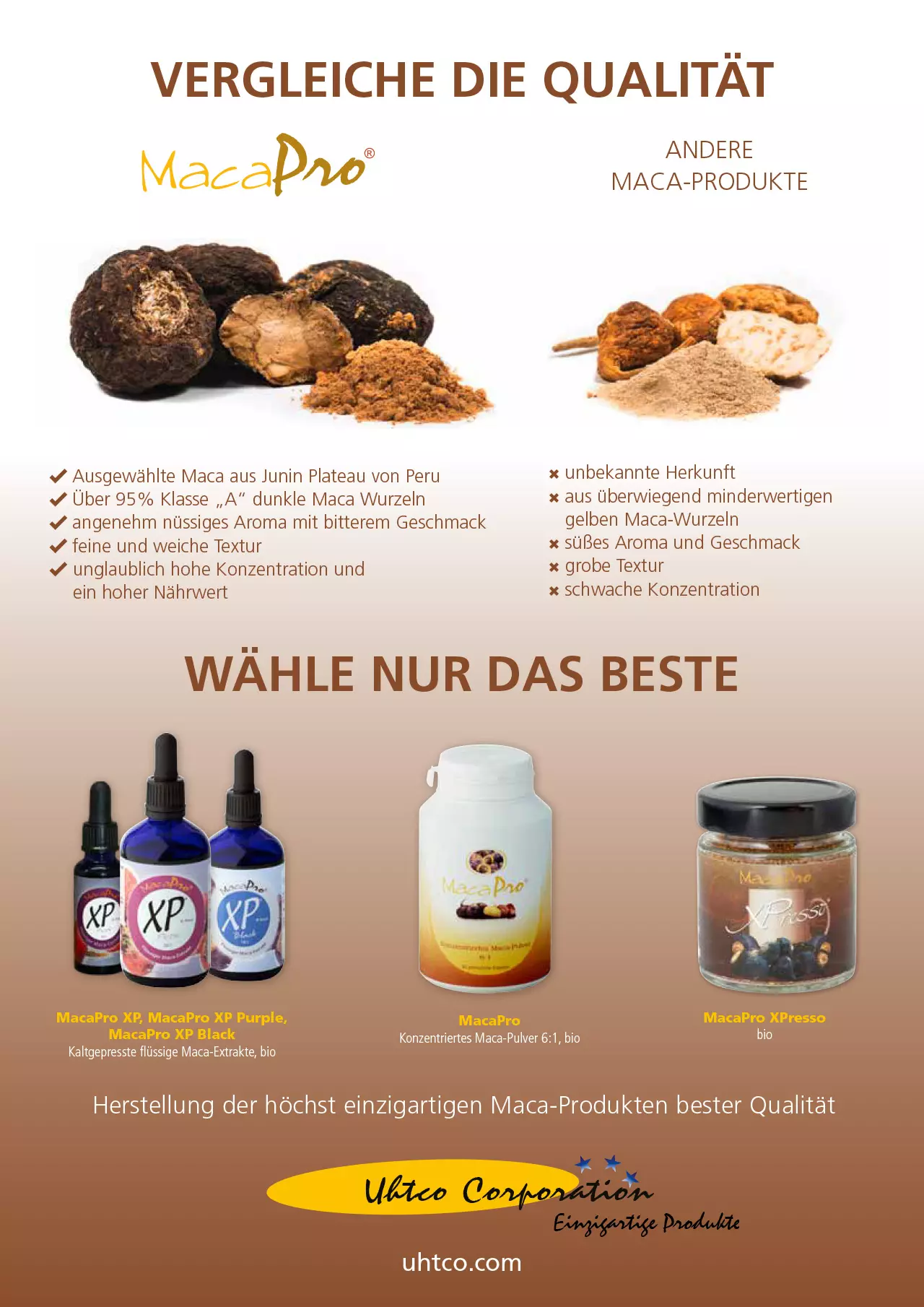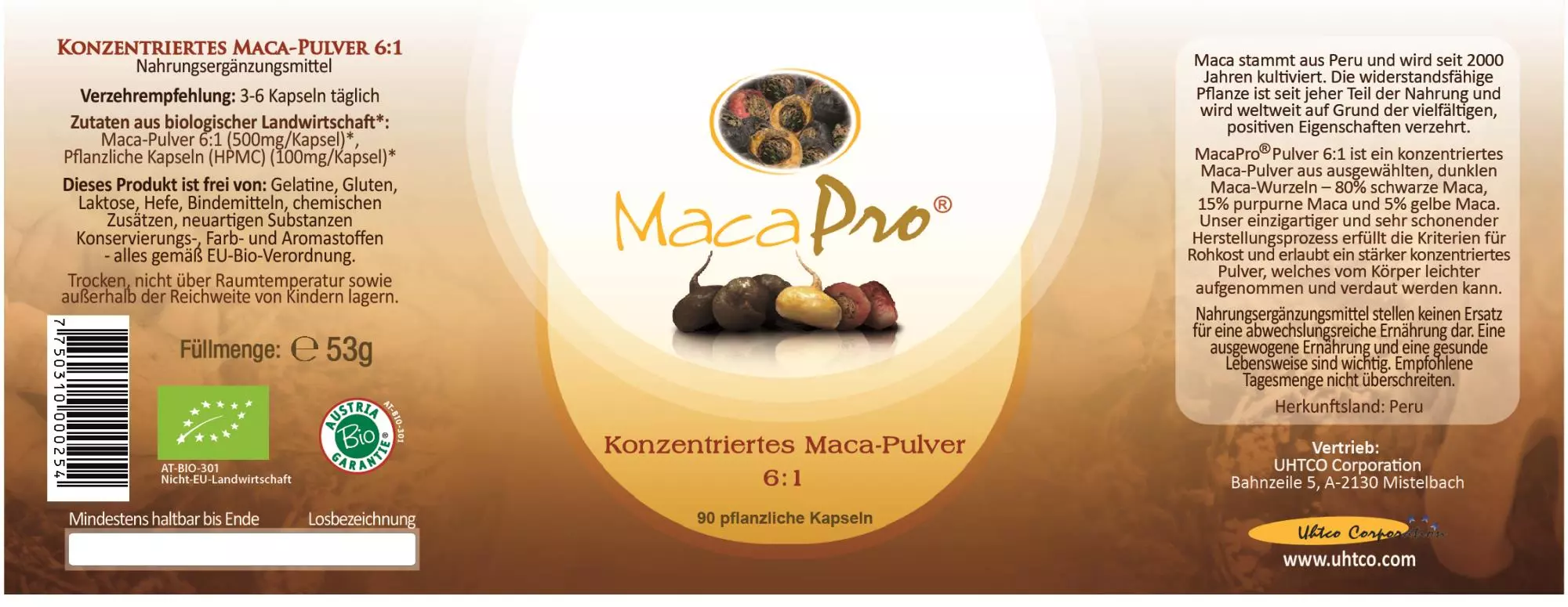 Maca stammt aus Peru und wird seit 2000 Jahren kultiviert. Die widerstandsfähige Pflanze ist seit jeher Teil der Nahrung und wird bereits weltweit auf Grund der vielfältigen, positiven Eigenschaften verzehrt. MacaPro Pulver 6:1 ist ein konzentriertes Maca-Pulver aus ausgewählten, dunklen Maca-Wurzeln – 80% schwarze Maca, 15% purpurne Maca und 5% gelbe Maca. Es erfüllt die Kriterien für Rohkost und der EU – Bio – Verordnung. Der einzigartige und sehr schonende Herstellungsprozess erlaubt ein stärkes konzentriertes Pulver, welches vom Körper leichter aufgenommen und verdaut werden kann.