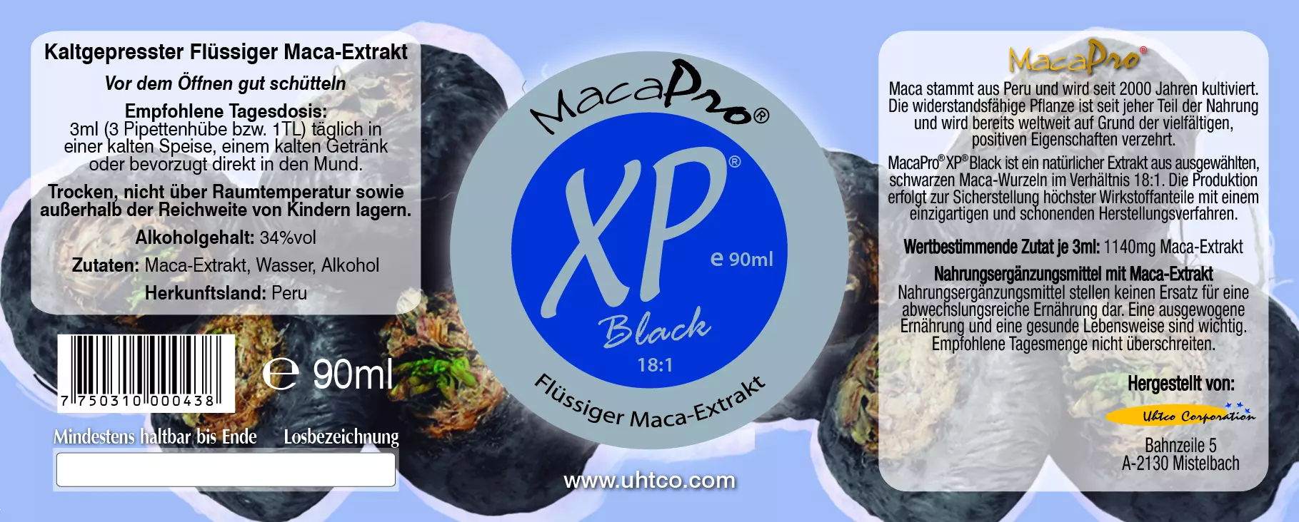 Maca stammt aus Peru und wird seit 2000 Jahren kultiviert. Die widerstandsfähige Pflanze ist seit jeher Teil der Nahrung und wird bereits weltweit auf Grund der vielfältigen, positiven Eigenschaften verzehrt. MacaPro XP Black ist ein natürliches Extrakt aus ausgewählten, schwarzen Maca-Wurzeln im Verhältnis 18:1. Die Produktion erfolgt zur Sicherstellung höchster Wirkstoffanteile mit auf die Pflanze abgestimmten, eigenen und schonenden Herstellungsverfahren.