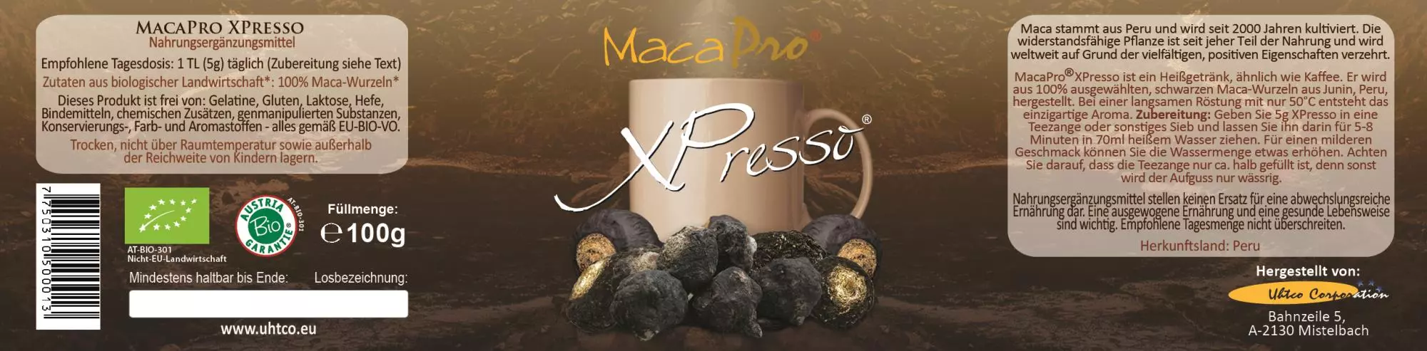 Maca stammt aus Peru und wird seit 2000 Jahren kultiviert. Die widerstandsfähige Pflanze ist seit jeher Teil der Nahrung und wird bereits weltweit auf Grund der vielfältigen, positiven Eigenschaften verzehrt. MacaPro XPresso wird aus 100% schwarzen Maca-Wurzeln hergestellt. Durch ein Röstverfahren bei nur 50°C wird das einzigartige, Aroma gewonnen. MacaPro XPresso ist eine gesunde, köstliche Alternative zur Tasse Kaffee, kann jedoch wie Kaffee zubereitet werden. Frei von Koffein bekommt der Körper ausschließlich die gute Energie von Maca.
