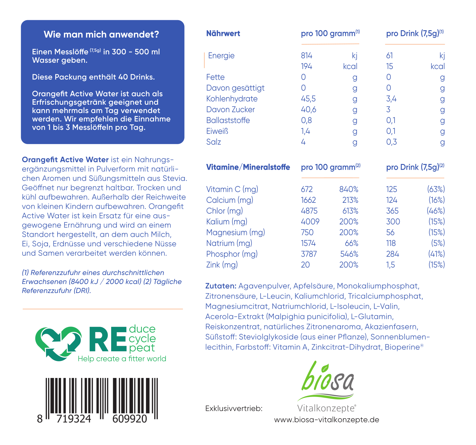 Ein Active Water - Drink enthält: 4 Elektrolyte, 3 BCAA´s, 15 Kalorien, 124mg Kalzium, 365mg Chlor, 300mg Kalium, 56mg Magnesium, 118mg Natrium, 50mg Vitamin C, 284mg Phosphor, 1,5mg Zink