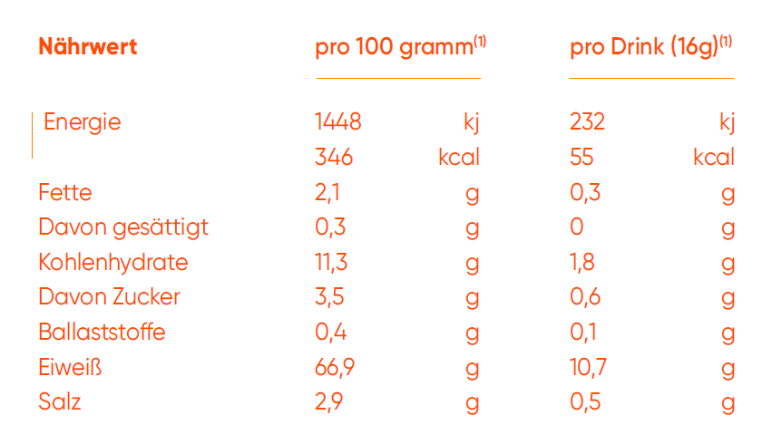 Ein Clear Protein Drink enthält: 56 Kalorien, 11,5g Eiweiß, 1,8g Kohlenhydrate, 0,4g Fett