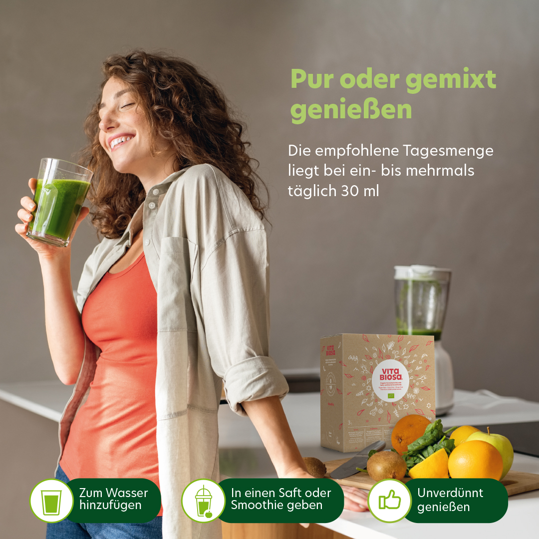 Die empfohlene Einnahme beträgt 30 ml ein- bis mehrmals täglich. Das Getränk kann pur oder mit Wasser, Saft oder Smoothies gemischt werden.