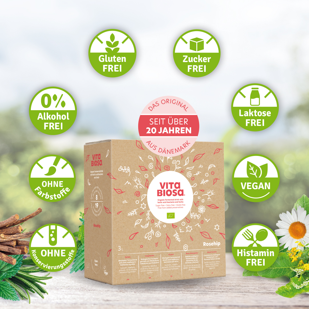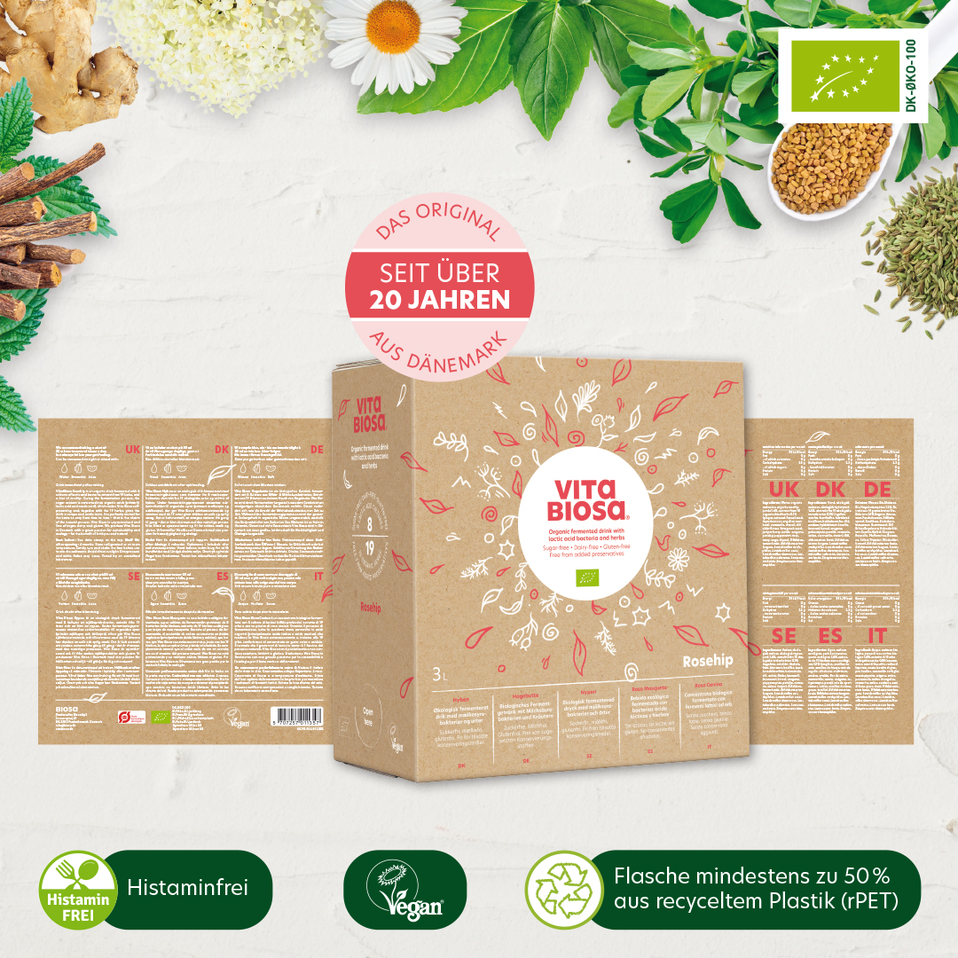 Vita Biosa ist ein kontrolliert biologisches Kräuterfermentgetränk aus Dänemark, das auf zwei der größten Erfindungen der Natur beruht: Milchsäurebakterien und Kräuter. Es enthält acht verschiedene Stämme von lebenden Milchsäurekulturen, organische Säuren und 19 sorgfältig ausgewählte Kräuter. Die einzigartige Mischung aus Kräutern, Säuren und Bakterien verleiht Vita Biosa einen frischen und angenehm säuerlichen Geschmack. Vita Biosa ist ein Naturprodukt, das frei von künstlichen Konservierungsstoffen, Zucker, Gluten und Laktose ist. Es wird auf natürliche Weise durch ein Fermentationsverfahren konserviert, bei dem die Kräuter und Milchsäurebakterien mit Wasser und Zuckerrohrmelasse gemischt werden. Die Bakterien verbrauchen den Zucker in der Melasse und wandeln ihn in organische Säuren um. Die Milchsäure verleiht Vita Biosa eine selbstkonservierende Wirkung. Sobald der gesamte Zucker der Melasse verbraucht ist, ist der Fermentationsprozess abgeschlossen und das Produkt ist zuckerfrei. Das fertige Produkt enthält dann lediglich Auszüge der Kräuter, organische Säuren und Milchsäurebakterien.