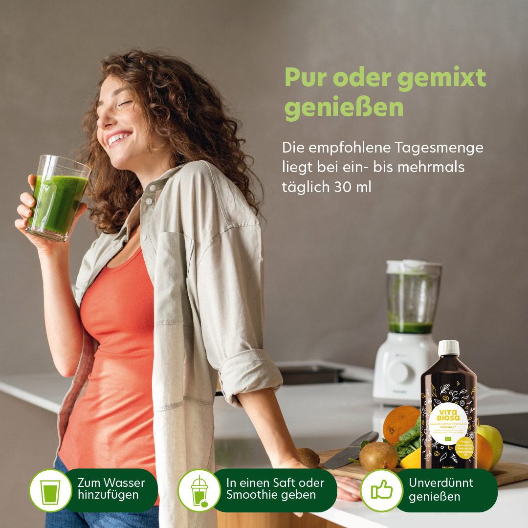 Du kannst Vita Biosa Ingwer ein- bis mehrmals täglich pur oder gemischt mit Wasser, Smoothie oder Saft genießen. Die empfohlene Tagesmenge liegt bei 30 ml. Bitte immer frisch zubereiten und direkt trinken. Die Produkte sollten nach dem Öffnen im Kühlschrank aufbewahrt und innerhalb von 2 Monaten verbraucht werden.
