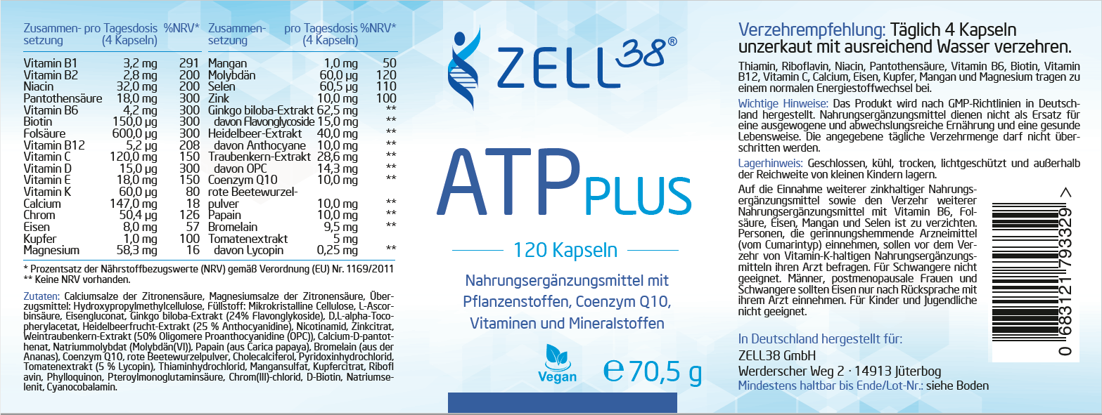 Zutaten: Calciumsalze der Zitronensäure, Magnesiumsalze der Zitronensäure, Überzugsmittel: Hydroxypropylmethylcellulose, Füllstoff: Mikrokristalline Cellulose, L-Ascorbinsäure, Eisengluconat, Ginkgo biloba-Extrakt (24% Flavonglykoside), D,L-alpha-Tocopherylacetat, Heidelbeerfrucht-Extrakt (25% Anthocyanidine), Nicotinamid, Zinkcitrat, Weintraubenkern-Extrakt (50% OPC), Calcium-D-pantothenat, Natriummolybdat (Molybdän VI), Papain (aus Carica papaya), Bromelain (aus der Ananas), Coenzym Q10, rote Beetewurzelpulver, Cholecalciferol, Pyridoxinhydrochlorid, Tomatenextrakt (5% Lycopin), Thiaminhydrochlorid, Mangansulfat, Kupfercitrat, Riboflavin, Phylloquinon, Pteroylmonoglutaminsäure, Chrom (III)-chlorid, D-Biotin, Natriumselenit, Cyanocobalamin